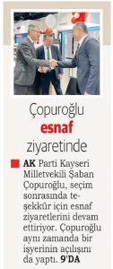 AK Parti Kayseri Milletvekili Şaban Çopuroğlu, seçim sonrasında teşekkür için esnaf ziyaretlerini devam ettiriyor. Çopuroğlu aynı zamanda bir işyerinin açılışını da yaptı.