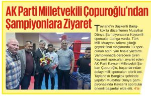 Taylandın Başkenti Bangkok’ta düzenlenen Muaythai Dünya Şampiyonasına Kayserili sporcular damga vurdu. Türk Milli Muaythai takımı çıktığı çeyrek final maçlarında 13 sporcunun adını yarı finale yazdırdı. Şampiyonada dereceye giren Kayserili sporcuları ziyaret eden AK Parti Kayseri Milletvekili Şaban Çopuroğlu, başarılarından dolayı milli sporcuları tebrik etti.