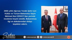 AK Parti Kayseri Milletvekili Çopuroğlu bu kez de Kültür ve Turizm Bakanı Mehmet Nuri Ersoy’u ziyaret etti. Çopuroğlu, “2000 yılllık Ağırnas Yeraltı şehri için Kültür ve Turizm Bakanımız Sayın Mehmet Nuri Ersoy’dan yerinde inceleme heyeti istedik. Bakanımıza ilgi ve alakalarından dolayı teşekkür ederiz” ifadelerini kullandı.