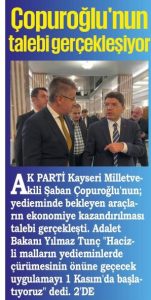 AK Parti Kayseri Milletvekili Şaban Çopuroğlu’nun, yedieminde bekleyen araçların ekonomiye kazandırılması yönündeki talebi hayata geçirildi. Adalet Bakanı Yılmaz Tunç, “Hacizli malların yedieminlerde çürümesinin önüne geçecek uygulamayı 1 Kasım’da başlatıyoruz.” dedi.