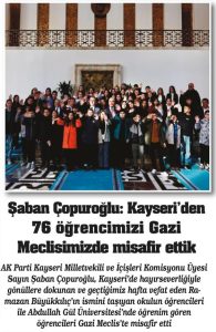 AK Parti Kayseri Milletvekili ve İçişleri Komisyonu Üyesi Sayın Şaban Çopuroğlu, Kayseri’de hayırseverliğiyle gönüllerde yer edinen ve geçtiğimiz hafta vefat eden Ramazan Büyükkılıç’ın ismini taşıyan okulun öğrencileri ile Abdullah Gül Üniversitesi (AGÜ) öğrencilerini Türkiye Büyük Millet Meclisi’nde misafir etti.